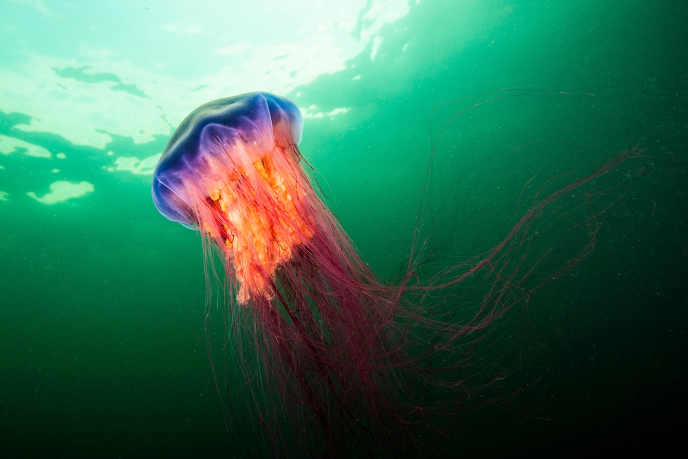 Dwarf Lion’s Mane jellies and Lion’s Mane jellies are similar in color to nettles, with pairs of stripes extending down their bells in floral-like patterns. Dwarf Lion’s Mane jellies seem to prefer the late summer season, while Lion’s Mane jellies can be spotted in the late fall and winter time.